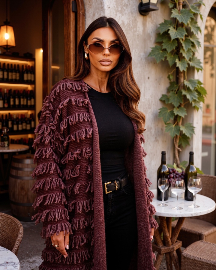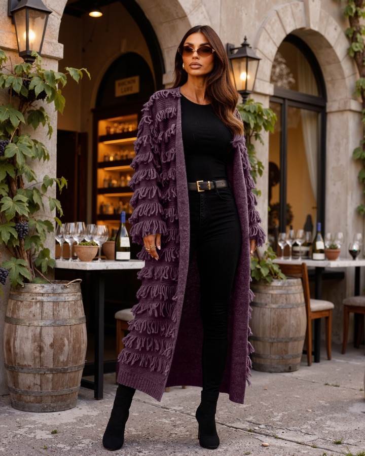 Wrap yourself in effortless sophistication with our Long Fringe Cardigan. This statement piece features textured fringe detailing throughout, adding movement and a touch of bohemian flair. Designed with an open front and a relaxed silhouette, it drapes beautifully over any outfit. Perfect for layering over jeans and boots for a chic, laid-back look or elevating your style with a bold edge.