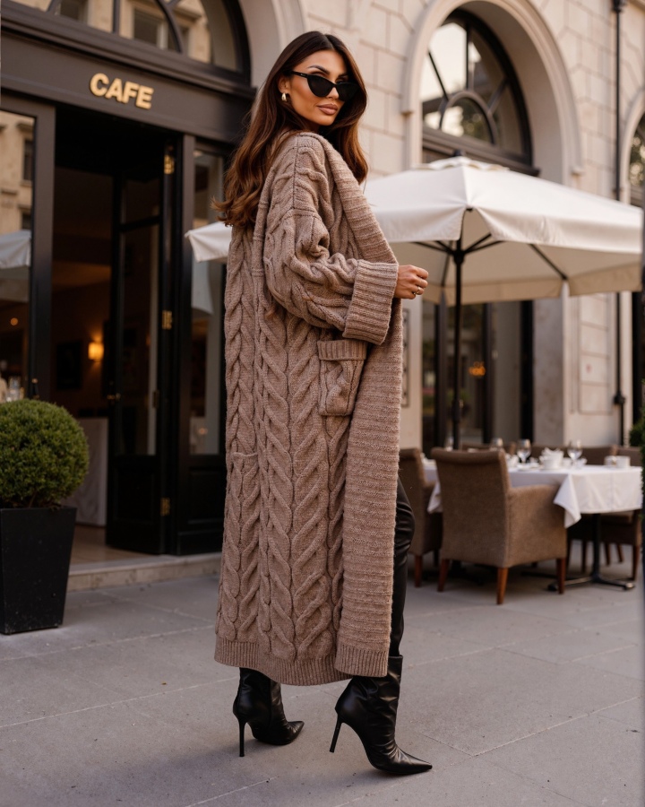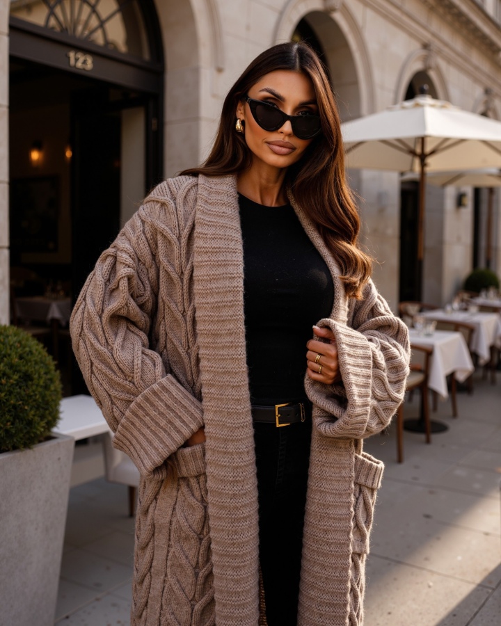 Elevate your everyday style with this long cardigan — the ultimate piece for chic and comfortable autumn looks. The cable-knit design adds texture and character, while its oversized fit exudes effortless elegance.