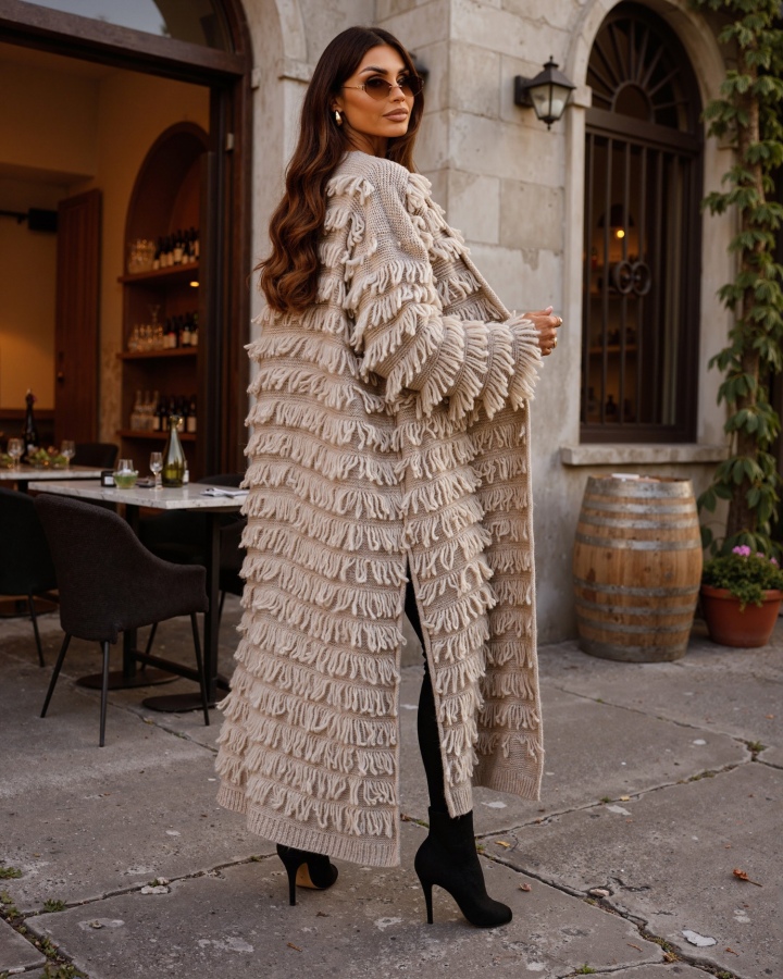 Wrap yourself in effortless sophistication with our Long Fringe Cardigan. This statement piece features textured fringe detailing throughout, adding movement and a touch of bohemian flair. Designed with an open front and a relaxed silhouette, it drapes beautifully over any outfit. Perfect for layering over jeans and boots for a chic, laid-back look or elevating your style with a bold edge.