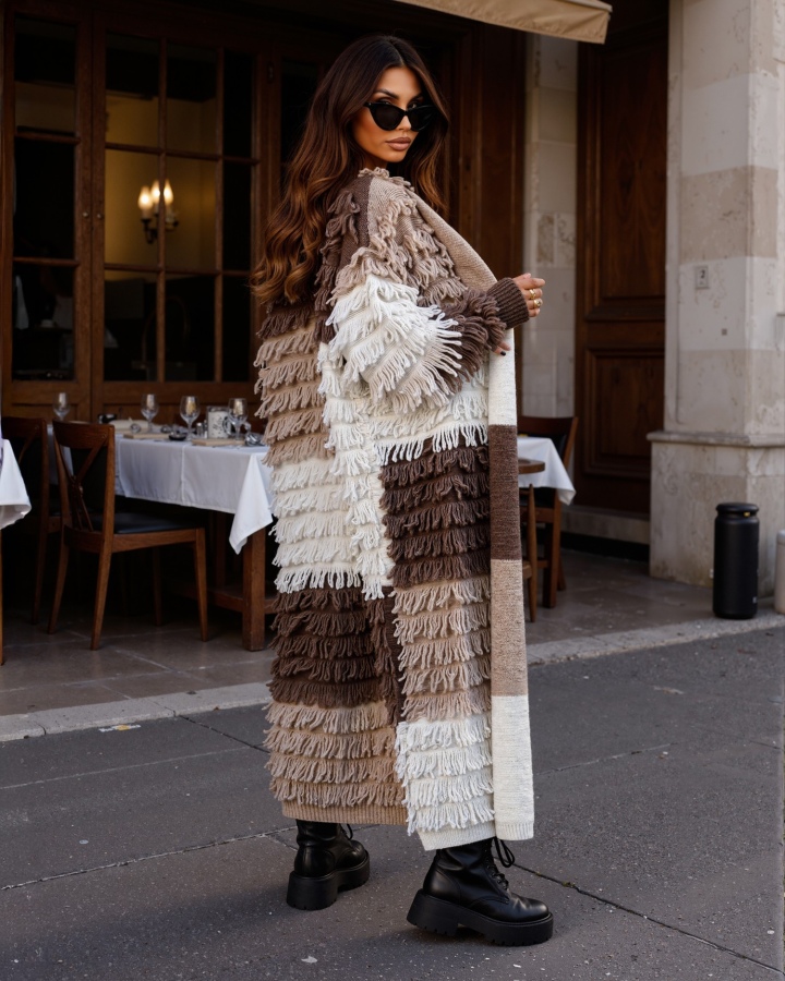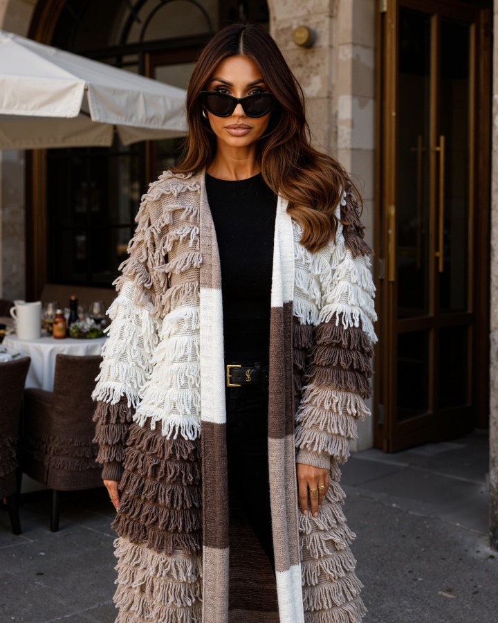 Refresh your autumn style with this stunning long cardigan that combines comfort and high aesthetics. It features a unique textured design with fringes in beige, brown, and white tones, creating a modern, boho-chic look.