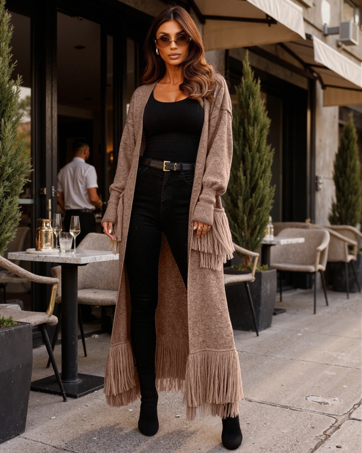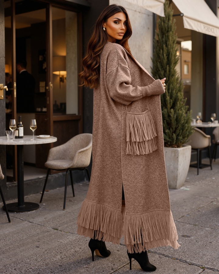 Zuza Light Brown Cardigan75,00 € Long cardigan with impressive fringe details on the hem and pockets. Its relaxed oversized fit ensures comfort and effortless style, while the full length makes it perfect for layering. Size Κάντε μία επιλογήOne SizeΕκκαθάριση Zuza Light Brown Cardigan ποσότητα Προσθήκη στο καλάθι Add to wishlistAdd to compare Κωδικός προϊόντος: CA00007 Κατηγορία: Cardigans Share this product Περιγραφή Περιγραφή Length: 127 cm Width: 57 cm Sleeve length: 50 cm Composition: 73% PA, 24% PL, 3% WOOL